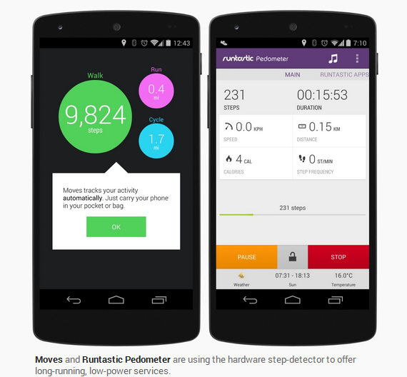 Android KitKat prikuplja senzorske podatke i dostavlja ih u paketima za obradu, čime se drastično smanjuje potrošnja baterije, čak i na uređajima bez namjenskih senzora za pokret ili obradu govora. Pored toga, Nexus 5 uključuje detektor koraka za pedometar i druge fitnes aplikacije.