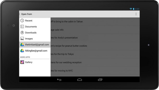 Sada možete otvarati i snimati datoteke i slike sa/na telefon ili tablet, Google Drive i na mnoštvo drugih skladišnih servisa, koristeći novi skladišni okvir sa spajalicama poput Galerije ili QuickOffice-a. Postoji i lista nedavnih fajlova svugdje, kako bi brže nastavili gdje ste stali.