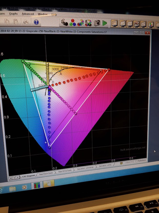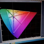 Odmah ispod, možete vidjeti da ekran Xperia-e Z2 ima veliku paletu boja (veću od standardne RGB palete) koja je uporediva i sa Super AMOLED ekranima. Grafikon ispod pruža vizuelni prikaz preciznosti ekrana Xperia-e Z2, sa malim tačkama širom granica trouglova koje predstavljaju stvarne mjere. Možete da vidite kako su tačkice pozicionirane veoma skladno, bez ikakvih velikih razmaka između njih. To znači da su boje precizno implementirane, a precizne boje čine doživljaj gledanja odličnim.