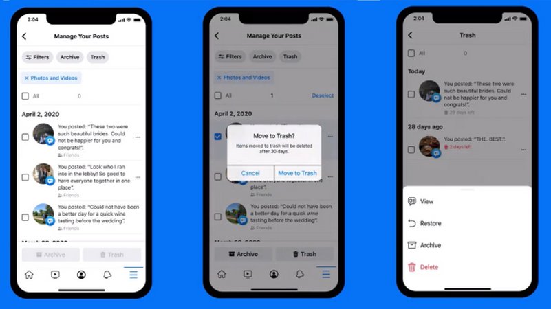 U ovu svrhu predstavljena je Manage Activity funkcija, koja omogućava grupno skrivanje ili brisanje objava. Funkcija omogućava da se na mnogo lakši način upravlja prisustvom na društvenoj mreži. Moguće je arhivirati (sakriti) sadržaj koji ne želite da drugi vide, ali koji i dalje želite da zadržite za sebe na platformi. Tu je i korpa za otpatke, gde premeštate stvari koje više nikada ne želite da vidite.