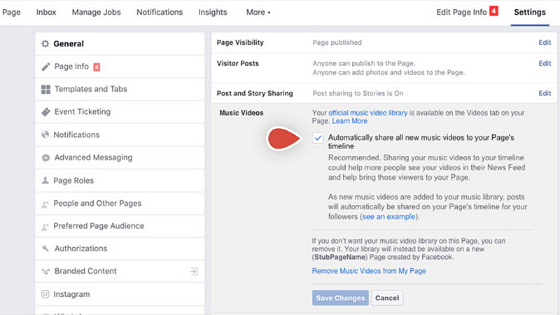 Vlasnici stranica koji su povezani sa izvođačima neće morati da upload-uju, ili linkuju video snimke. Umesto toga, biće na raspolaganju nova opcija u podešavanjima kojom će moći da daju Facebook-u pravo da dodaju video snimke na njihove stranice, gde će fanovi moći da ih gledaju u Video tab-u.