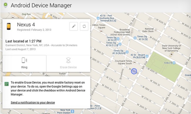Mapa kaže da njegova lokacija ima tačnost u krugu od 24 metra – cifra koja je i više nego respektabilna kada se uzme da je uređaj bio u neboderu na Menhetnu. Nažalost, još ne postoji način da pošaljete poruku na vaš uređaj, što je zgodna opcija za koju se nadamo da će Google dodati u kratkom roku. Kada dostigne do svih korisnika, Android Device Manager će biti kompatibilan sa Android hardverom koji pokreće 2.2 ili noviju verziju operativnog sistema.